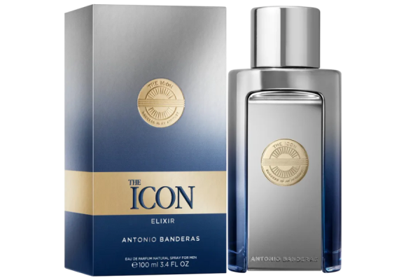 The Icon Elixir Eau de Parfum da grife Antonio Banderas, família olfativa amadeirado especiado, perfume masculino espanhol lançado em 2023.