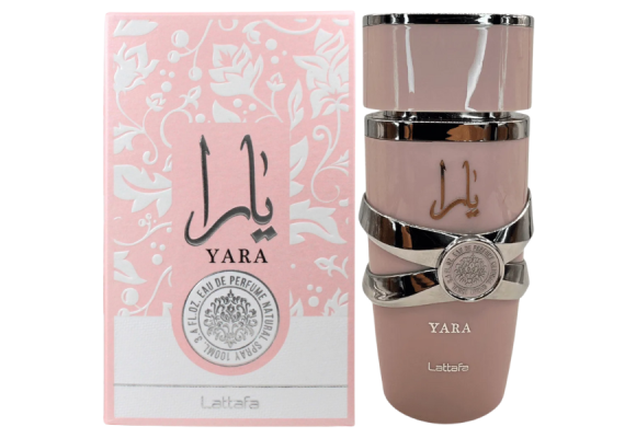Yara Eau de Parfum da grife Lattafa, família olfativa oriental baunilha, perfume feminino dos Emirados Árabes Unidos lançado em 2020.